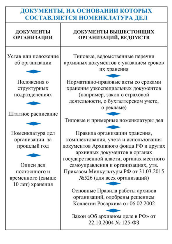 Номенклатура дел составляется на основании некоторых внутренних документов организации, а также документов вышестоящих организаций и ведомств.