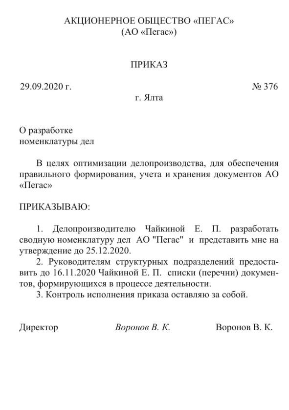 После того, как принято решение о разработке номенклатуры дел, создается приказ (распоряжение) руководителя организации или уполномоченного им лица. Приказ составляется в произвольной форме. В документе нужно указать, на кого возложена разработка номенклатуры, кто контролирует данный процесс, а также сроки исполнения. В преамбуле обозначается цель разработки, смысл, зачем издается приказ. Сформулировать можно по-разному: «Во исполнение архивного законодательства», «В целях правильного формирования дел», «Для обеспечения правильного формирования, учета и хранения документов организации» и т. д.