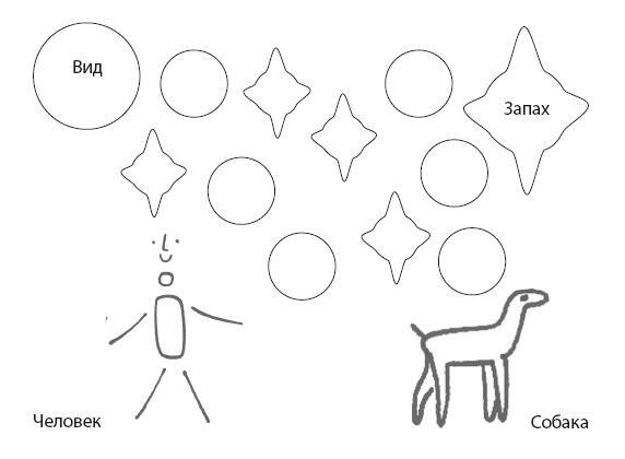 Представьте себе опыт собаки. Выходит она на дорогу и знает вот здесь прошли такие-то люди и животные, вон там кошка, вот за тем поворотом должно пахнуть ежиком. Собака ориентируется в запахах, как вы в цветных формах. Представьте картинку в мозгу собаки, состоящую из смутных форм и очень четких запахов. Собака больше помнит «тот запах в месте, в котором есть объект с запахом, следом поворот к запаху такому-то», а не «то место, за тем поворотом».