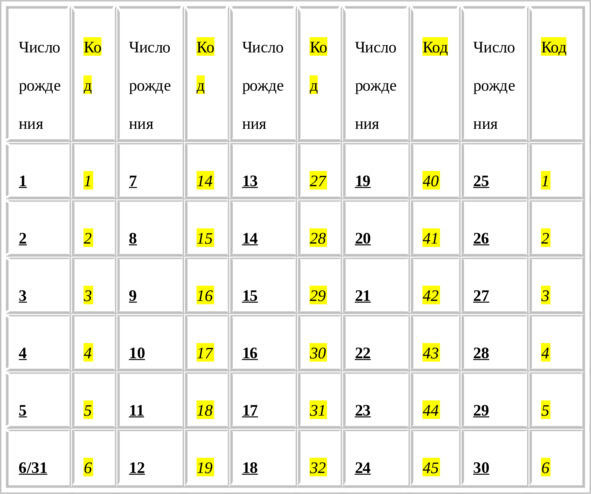 Второй инструмент это совокупность матрицы и уровней развития. Ниже вы найдете таблицу, которая поделена по шести уровням на матричные коды. Найдите свое число рождения, напротив него будет стоять матричный код, который соответствует вашему числу рождения.
