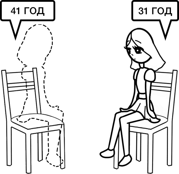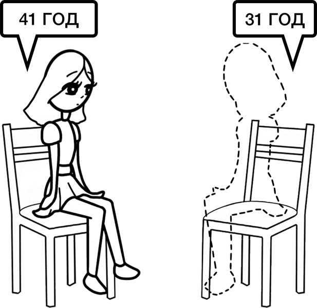 Валентина: Хорошо. Теперь представь, что тебе 31 год + 10 лет = 41 год. И ты прожила все это. А вот на том пустом стуле напротив тебя сидит 31-летняя Жанна, у которой всего этого не было.
