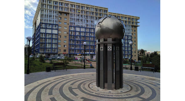 Далее мы проедем по улице Лермонтова до небольшого сквера у жилого комплекса «Прогресс» по левую сторону дороги (ул. Лермонтова, 267/1), где в 2018 г. к 55-летию Академгородка по задумке депутата городской думы А. В. Сафронова появился памятный знак в виде земного шара, опирающегося на одиннадцать колонн, символизирующих институты. Мощение площадки вокруг выполнено в виде лабиринта с несколькими входами, как символ поиска научных знаний.