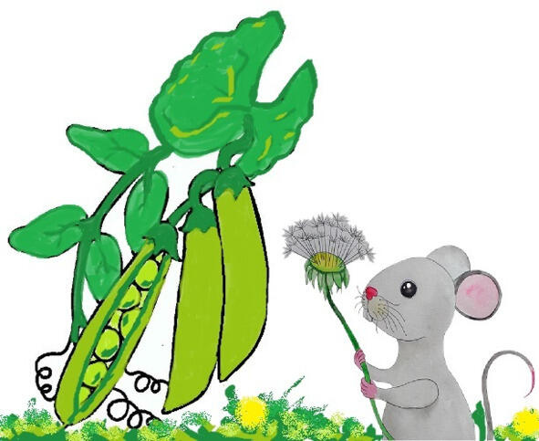 Однажды мышонок играл на лесной полянке он бегал наперегонки со стрекозами от цветка к цветку, прыгал с кузнечиками кто выше, а когда устал, лёг на мягкую траву отдохнуть. Вот тут он и увидел в этой самой траве, возле кротовой норки, жёлтую сухую горошину. Мышонок подумал, что неплохо было бы сейчас подкрепиться. Но не успел он подобраться к своей находке, как откуда ни возьмись появился суслик. Он тоже увидел горошину и уже потянулся за ней лапой.