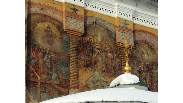 In the murals, from left to right you can see scenes of christening the local Buryat population, the image of Epiphany, as well as the rite of passage of the first bishop of Irkutsk and Nerchinsk known as St. Innocent Kulchitsky. In addition, on the southern wall of that temple you can also see the icon of the Savior Not Made by Hands, images of St. Nicholas and St. Mitrofan of Voronezh.