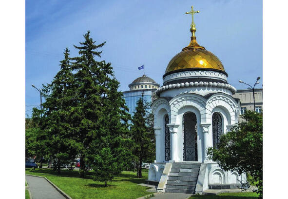 Just behind the stele you can see a small chapel built on the initiative of the administration on October 4, 2000 on the place of the altar of the Kazan Cathedral destroyed in 1932. It is a miniature copy of one of the domes of the temple. Inside groundwork of the building is laid with the stones from the foundations of the lost church.