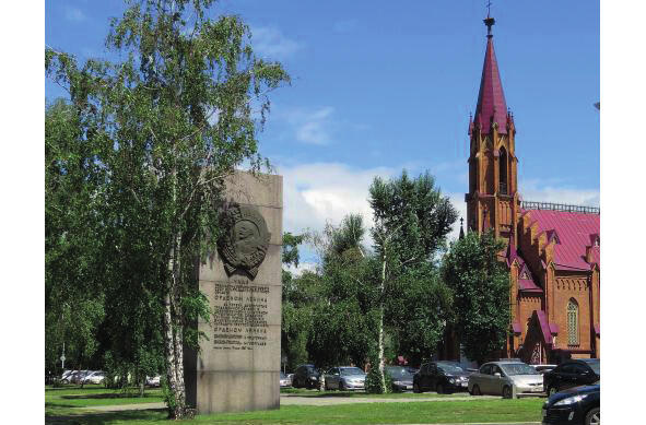 At the end of the street we are met again the Polish Church, and we turn left and move towards the main city square. On the right we see a small stele made of pink granite, which was installed in memory of the awarding of the Irkutsk Region with the Order of Lenin on June 8, 1967 for the successes achieved by workers in the field of economic and cultural construction, the creation of large industrial and energy complexes on the Angara River.