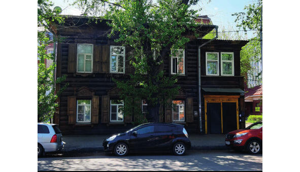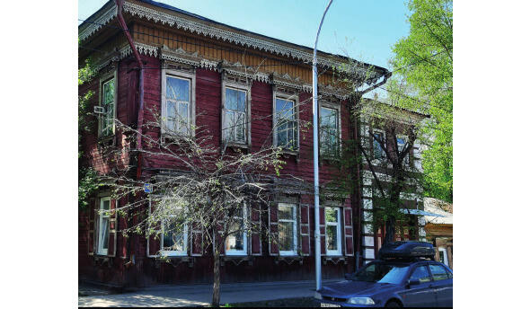 At the crossroads we run into a wooden house of Pyatidesyatnikov and turn left. This quarter is full of beautiful wooden apartment buildings from the late 19th century. Particularly notable is the pink mansion with its brick stone outbuilding, which belonged to a certain Bibikov and where lived for a long time one of the founders of Writers Union of Irkutsk, as well as a delegate to the first Congress of Soviet Writers I.G. Goldberg.