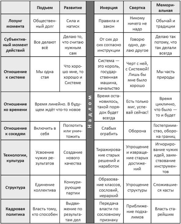 5) Система вступает в Инерционную Фазу. Она же Фаза Расцвета. Победителем провозглашается лозунг «Будь как Я!» То есть предлагается шаблон поведения, пример для подражания, иногда из героев прошедшей героической эпохи. Крайняя регламентация жизни и работы, «Ordnung!», установление четкой иерархической организационной структуры сообщества. Разграничение предметов деятельности, зон ответственности, сфер влияния. Стандарты жизни. Упорядочивание всего и вся: Законы и Правила. Накопление материальной культуры, создание и сохранение огромного количества культурных, научных, технических и прочих памятников. Одним словом, Инерционная Фаза это расцвет, Цивилизация. Именно этносы этого периода жизни создали все то, что сегодня мы называем Древним Египтом, Элладой, Древним Римом, цивилизациями Майя и Ацтеков, эпохой Ренессанса. Оказывается, однако, что эпоха просвещения и цивилизации это на самом деле вовсе не расцвет, «весна», а закат, «осень» системы. Все многочисленные плоды Инерционной Фазы суть лишь постепенное рассасывание прежнего пассионарного заряда. Действительно, «золотая посредственность» вот общественный идеал этой эпохи. Творения художников, ученых, техников, хоть и многочисленны, но уступают по качеству достижениям беспокойной эпохи Бури и Натиска. Преобладает подражательство. Не творцы, а ремесленники, не Художники, а Изготовители. Общественный идеал материальная выгода. Если фазы подъема, развития и надлома можно назвать Эпохой Рыцарства, то все последующие этапы Эпоха Торгашества: все только за деньги, альтруизм и героизм смешны, личный доход мерило всего. Идет стирание особенностей, выдающиеся личности преследуются, загоняются в рамки стандарта. (Однако после гибели их охотно канонизируют!) Ревнители традиций и закона, консерваторы вот фавориты системы на этом этапе.