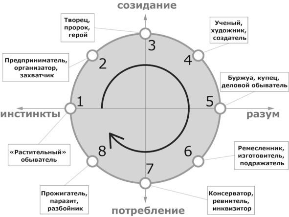 Можно допустить, что сама активность личности есть неизменный по величине импульс, вектор, а вот направление приложения наших сил меняется согласно общественной доминанте.