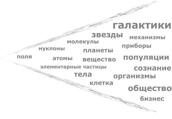 Традиционно схема науки представляется в виде расходящегося луча, острие которого находится где-то в нижнем конце оси, по которой можно выстроить все объекты нашего мира по их сложности от мельчайших частиц до галактик, живой природы, сознания и куда-то далее.