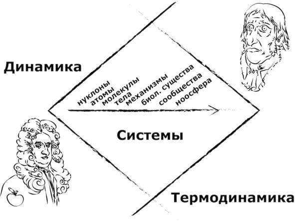 Луч законов Термодинамики направлен со стороны высших систем природы навстречу лучу законов Динамики. В районе систем, на которые человек испокон века смотрит, как на объекты своих воздействий, расположены три основных постулата, которые физики назвали Началами термодинамики. Ближе к острию луча, то есть там, где расположены системы, над которыми человек уже не властен так, как над газом или жидкостью в сосуде, как минимум потому, что сам является их частицей это биологические или социальные объекты, расположены закономерности неравновесных систем. А в самом острие второго луча можно предположить существование еще не открытых фундаментальных законов, которые должны объединять все вложенные друг в друга системы. Возможно, например, там существует некий Закон баланса, который свяжет явление глобального расширения и остывания Вселенной с появлением в ее локальных частях все более «горячего» упорядоченного, высокоорганизованного движения материи. Однако такие закономерности мог бы разглядеть лишь тот, кто находится в самом острие луча кто на все сущее в любой его сложности может смотреть сверху вниз, кто выше всего то есть Всевышний. Науке до таких высот еще очень далеко. Даже существование инопланетных форм жизни до сих пор является лишь гипотезой.