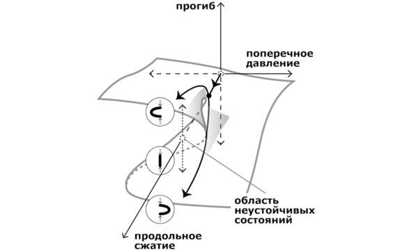 Область неустойчивости представлена треугольным «язычком», обозначена пунктиром в середине складки, куда система может попасть и какое-то время пробыть в таком состоянии, пока любое бесконечно малое воздействие не выбросит ее в одну из зон устойчивости прогиб в одну или другую сторону.