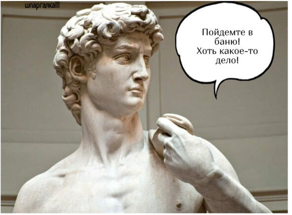 Наконец, очередь дошла до любимого профессором образа скульптуры Микеланджело «Давид». Развернув перед учащимися слайд с фотографией, профессор решил уточнить у аудитории, что в руках у смелого юноши и куда он собрался.