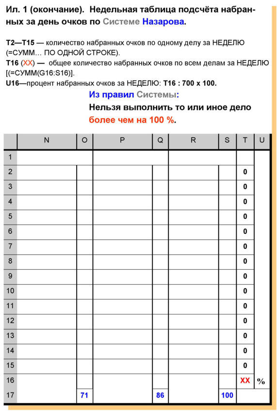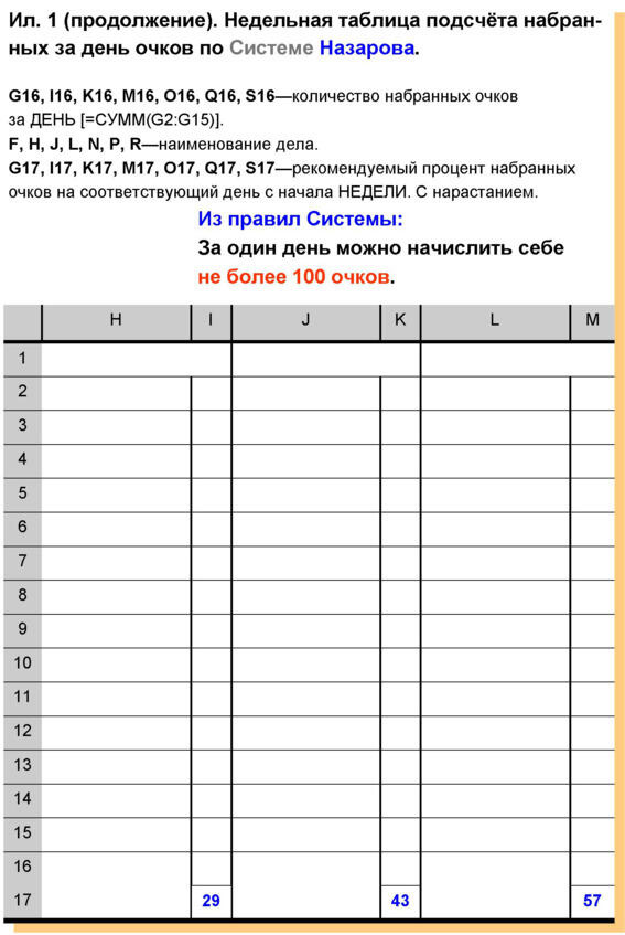 Если мы набираем в день 100 очков, то это означает 100-процентное выполнение дневного «самозадания». По очкам. Подчёркиваю по очкам. Нередко случается так, что какое-то дневное задание не выполняется. Вместо него выполняется другое задание. В большем объёме, чем планировалось.