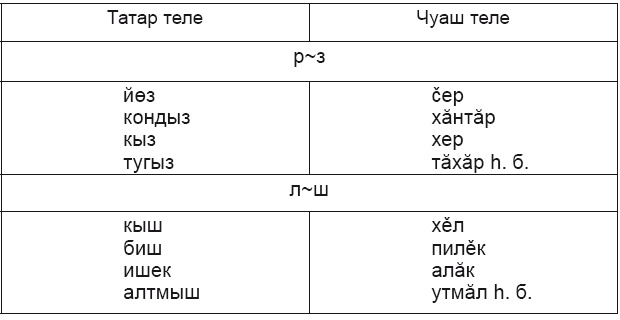 Гадәти төрки телләр (шул исәптән татар теле) һәм чуаш теле өчен, мәсәлән, шундый ук закончалыклы фонетик күренеш р~з, л~ш тәңгәллеге хас.