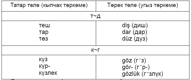 Кыпчак һәм угыз төркеменә кергән төрки телләр өчен, мәсәлән, сүз башында т~д, к~г даими аваз тәңгәллеге хас.