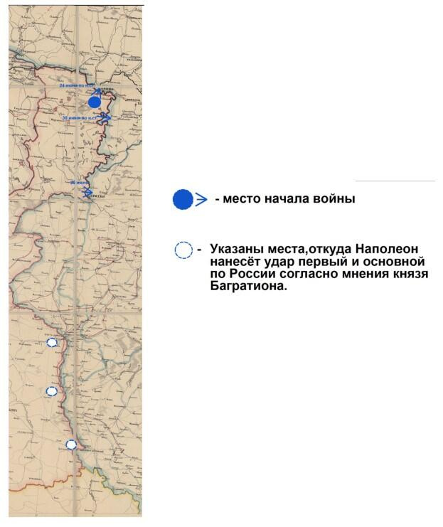 В день начала войны, князь Багратион, не зная, что она уже развязана в 4 утра Наполеоном, представляет Военному министру свои рассуждения о месте вероятного нанесения удара противником: «Я не могу думать иначе, как неприятель до сих пор делает одну лишь демонстрацию, и что его точное стремление не должно быть на те пункты, где его более ожидаем (моё дополнение- Гродно-Ковно). Его выгода непременная разделить наши силы и он, по мнению моему, будет стараться воспользоваться сим, как имел честь докладывать выше, у Устилуга, Влодавы и Бреста. Неприятель не может не видеть, что при действительном впадении его в границы наши, чем он ближе будет к морю, тем более рискует быть отрезанным и истребленным. Из чего заключить следует, что сосредоточие сил неприятельских между Гродно и Ковно есть не что иное, как желание отвлечь наши силы от пунктов настоящих его стремлений».