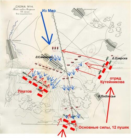 Прибывшее подкрепление расположилось южнее деревни Озерски и в районе дороги Мир-Несвеж с 12 пушками. Последний укреплённый район являлся основным, и главновное его назначение было не дать возможность прорыва неприятеля в сторону отдыхающих после длительного марша войск князя Багратиона. По тому, как быстро пришло подкрепление Платову можно судить о чрезвычайной близости хвоста армии Багратиона от противника. Медлительность действий войск младшего брата Наполена, Жерома Бонапарта , была на руку действиям 2-ой армии князя Багратиона. Скоро за его медлительность он перейдёт в подчинение маршала Даву. На что Жером обидится и вообще покинет театр военных действий.