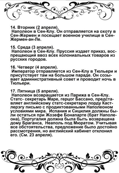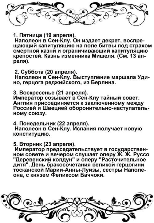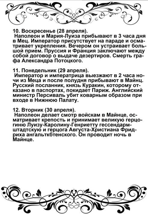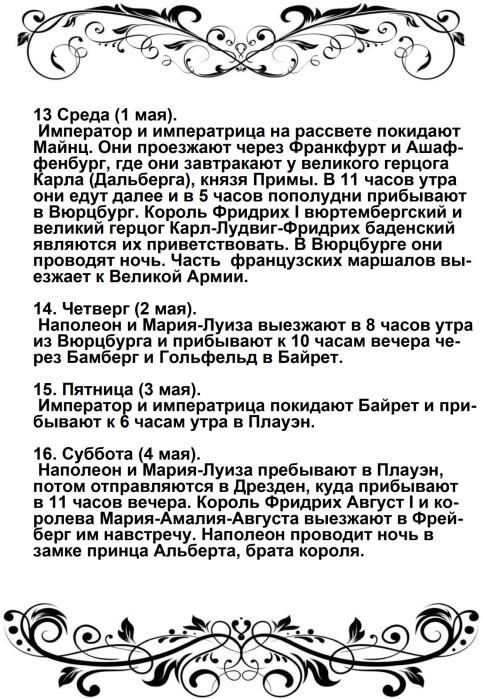 Дверца отворилась, и из кареты быстро вышел Наполеон в сопровождении герцога Иевшательского (пояснение от автора Бертье, Луи-Александр- маршал, начальник штаба Великой армии): не было видно ни одного адъютанта, ни одного ординарца. Немного спустя, прискакал верхом генерал Брюйер (командир 1-й дивизии тяжелой кавалерии), один, без свиты. Наполеон был в своей форме гвардейского стрелка; он, по-видимому, очень устал от дороги, и черты лица его выражали заботу.