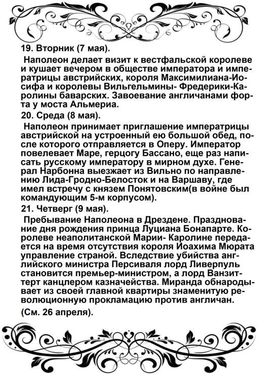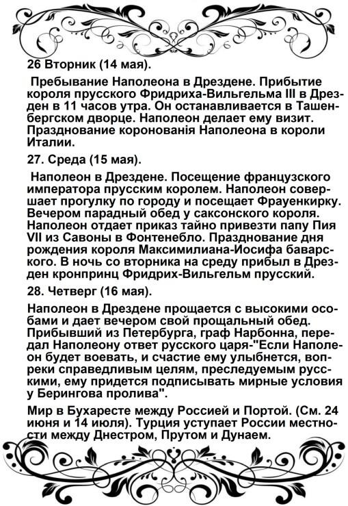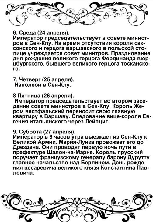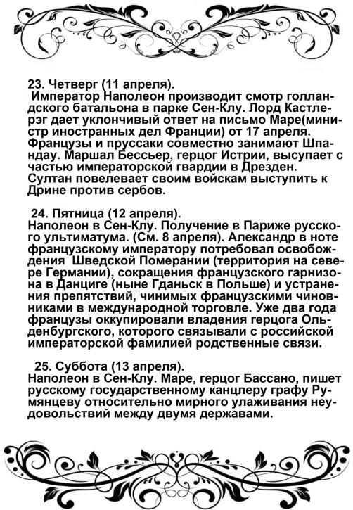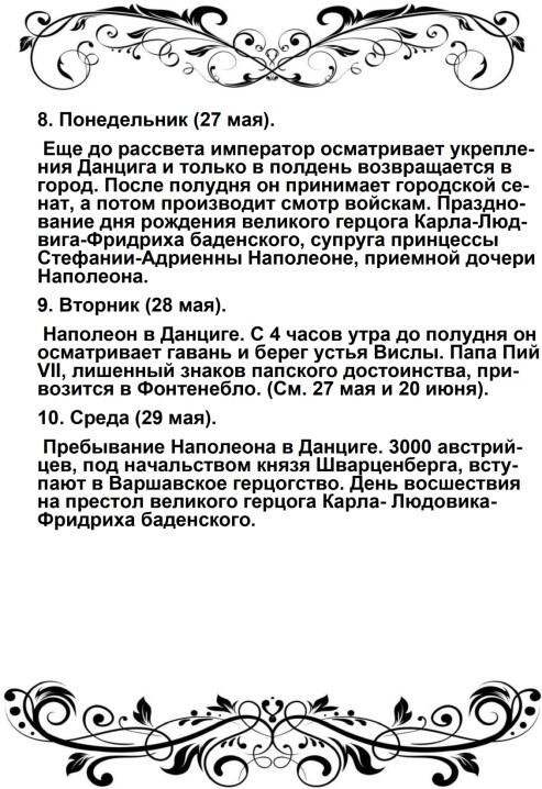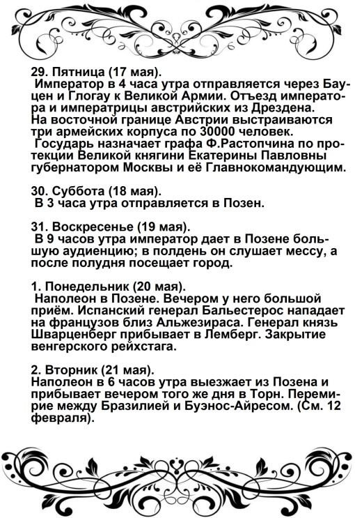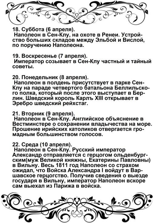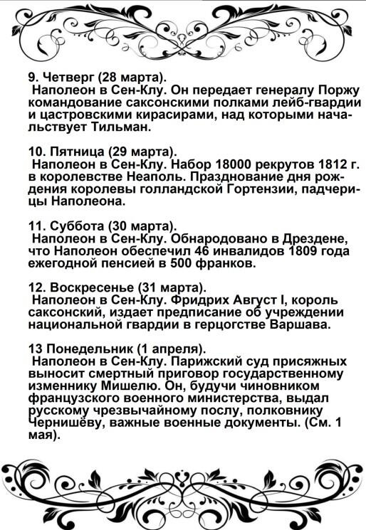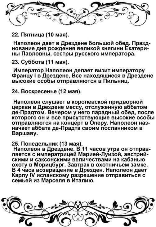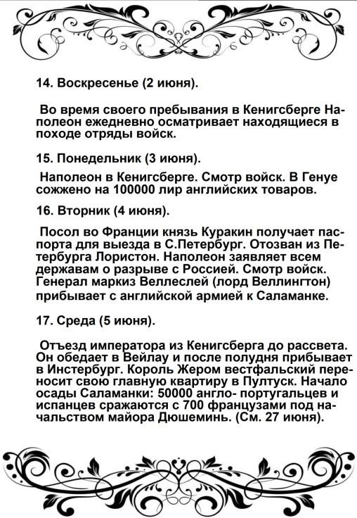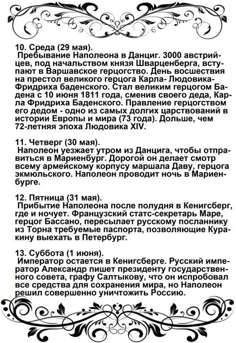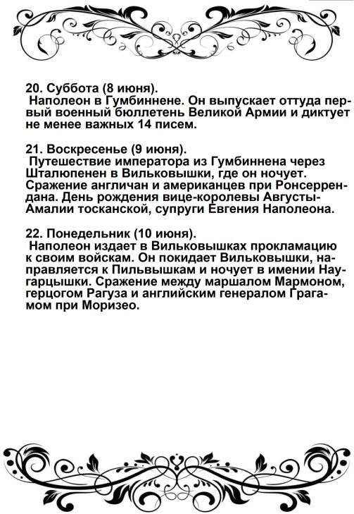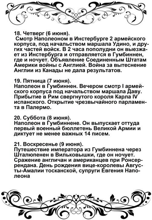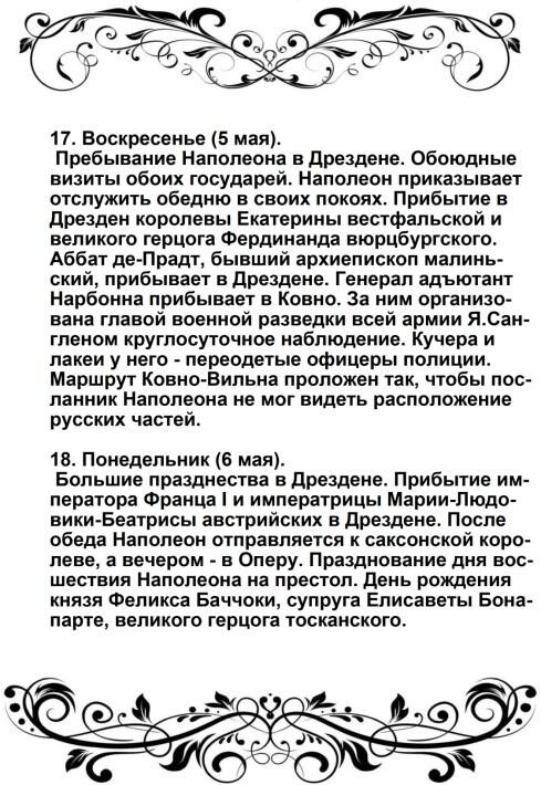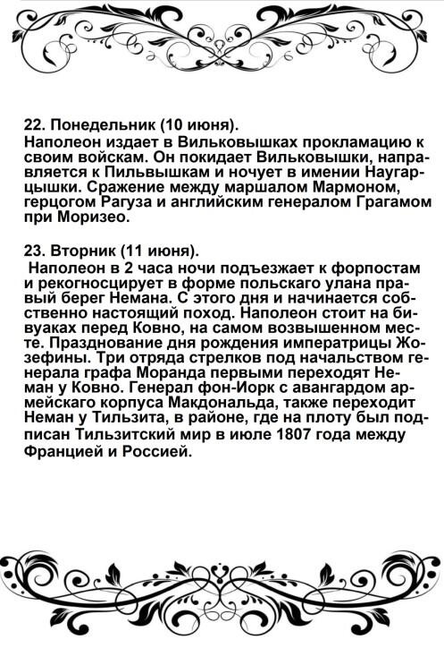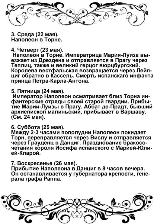 «23 июня (пояснение от автора по настоящему времени). Когда наши кавалеристы (6-го Польского уланского полка) еще отдыхали в своих биваках, на Кёнигсбергской дороге показалась быстро мчавшаяся почтовая карета, запряженная шестью рысаками, и сразу остановилась в самой середине нашего лагеря. Ее сопровождало лишь несколько гвардейских стрелков, на запыхавшихся лошадях, которые еле могли стоять от страшной усталости.