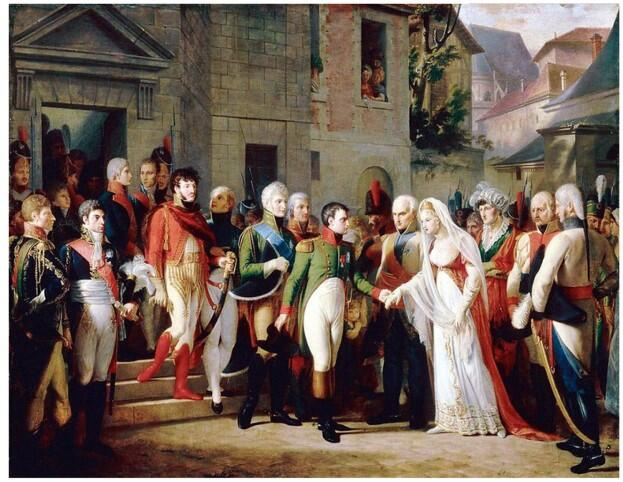 Наполеон I встречает королеву Прусскую в Тильзите 6 июля 1807 года. Слева от Наполеона стоит Александр I, между Наполеоном и Луизой прусский король Фридрих -Вильгельм III. Это вымысел художника Жан-Шарль Тар-Дьё. Александра I не было, хотя он был неравнодушен к Луизе. Вероятно, художник поместил Александра, зная их взаимные чувства друг к другу.