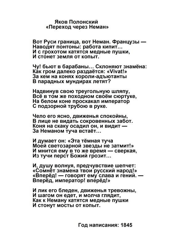 «Не успел император перейти реку, как в воздухе пронесся какой-то глухой шум. Вскоре начало темнеть, поднялся ветер, и до нас донеслись раскаты грома. Это угрожающее небо и окружающая нас пустынная местность, где мы не могли найти убежища, нагнали нас уныние. Многие из тех, кто раньше был охвачен энтузиазмом, испугались, видя в этом роковое предзнаменование. Им представлялось, что пламенеющие тучи скапливались над нашими головами и спускались на землю, чтобы преградить нам вход в Россию». Французский генерал Филипп Поль де Сегюр.