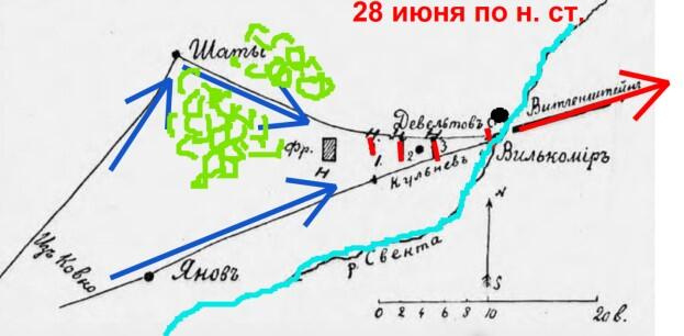 Для прикрытия главных сил 1-го корпуса и для наблюдения дорог, ведущих из Шат и Янова к Вилькомиру в Девельтово в 6 верстах от Вилькомира был расположен арьергард под командованием ген.майора Кульнева в составе двух егерских полков, четырёх эскадронов гусарского полка, трёх сотен донских казаков и 6 орудий. 16(28) июня один из разведывательных разъездов доложил о приближении крупных сил противника со стороны Шаты. Генерал Кульнев приказал выдвинуть два орудия вперёд и когда кавалерийская колонна неприятеля появилась на дороге, выйдя из леса, дал команду открыть огонь. Прозвучал первый артиллерийский выстрел в этой войне и он был наш, русский. Неприятельские войска, не имевшие при себе артиллерии, приведены были в беспорядок и скрылись в лесу. Генерал-лейт. Уваров, командир 1-ого кавалерийского корпуса выделил Кульневу в поддержку драгунский полк. Пехотный корпус графа Витгенштейна продолжал переправу своих частей через р. Свенту в Вилькомире. В полдень противник, получив поддержку и намерение отобедать уже в Вилькомире, предпринимает атаку. Кульнев чередуя артиллерийскую кананаду и кавалерийские атаки сдерживает противника в течении двух часов. Получив информацию о завершении перехода корпуса через Свенту он отходит в Вилькомир под прикрытием атак кавалерии на открытой местности и пехоты в кустах. Затем пройдя город, успешно переходит Свенту и ружейным огнём пехоты из-за заборов уже с левого берега реки обеспечивает переход реки оставшимся частям.
