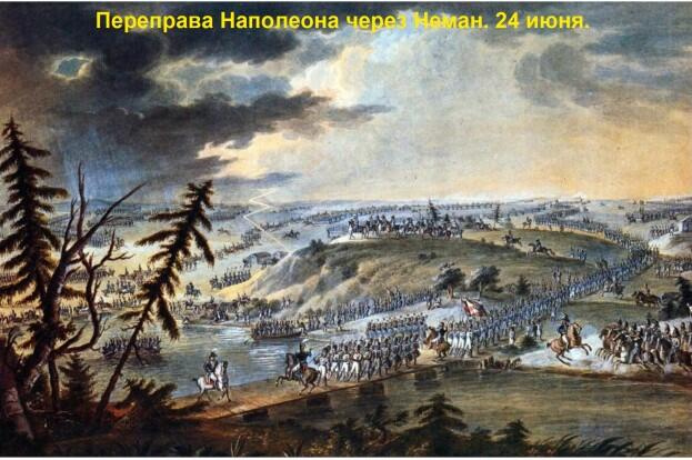 Вот как описывает очевидец перехода реки Неман доктор армии Наполеона Д.Роос: «мимо нас двигались отряды пехоты, кавалерии, артиллерии и обозы. Это зрелище было чрезвычайно красиво, и различие наций, рода оружия, цветов одежды и военная музыка со всех сторон делали его красочным и шумным. Порядок был образцовый, войска принаряжены, как к параду; все выглядели бодро, однако не весело, и никто не пел. Мы также, подвигаясь вперед, остановились на возвышенности близ берега Немана и были застигнуты здесь страшною грозой с её громовым ревом и проливным дождем. Последний промочил нас до костей. Интересное и красивое зрелище представляли во время грома и дождя все возвышенности и долины, наполненные войсками, ожидавшими совершенно тихо и спокойно конца грозы. Когда дождь прошел, всё опять пришло в движение. Потянулись полки за полками. Под вечер и до нас дошла очередь, и мы, перейдя мостки, очутились в той земле, где осталось большинство из нас. Это было недалеко от Ковны, близ того места, где Вилия впа- дает в Неман».