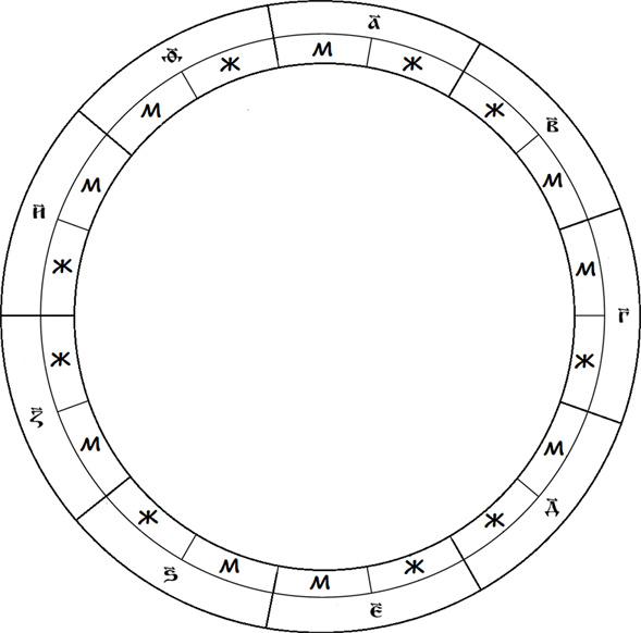 Дома СтихийДома Стихий это девять отрезков небесной сферы, расчет которых производится на основе суточного вращения нашей Земли вокруг своей оси, где восточная линия горизонта играет роль начала отсчёта и обозначается сокращением от буквицы Азъ. Другими словами, Аз это градус восходящего знака в определённый момент времени. Таким образом, знак в котором находится Аз, будет являться началом отсчёта сетки домов, то есть первым домом.
