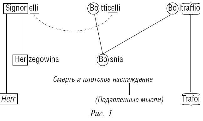 Имя Signorelli раскладывается как бы на две части. Последние два слога (-elli) воспроизводятся в точности в одном из подставных имен (Botticelli), а первые два подвергаются переводу с итальянского языка на немецкий (signor Herr), устанавливают целый ряд сочетаний с тем словом, которое фигурировало в вытесненной теме (Herr, Herzegowina), но по этой причине выпадают из сознательного воспроизведения. Замена произошла так, будто случилось некое смещение вдоль по словосочетанию «Герцеговина и Босния», причем независимо от смысла этих слов и от звукового разграничения отдельных слогов. То есть названия механически разделились, как обычно поступают с картинками-загадками при составлении ребусов. В результате имя Синьорелли заменилось двумя другими без всякого участия сознательного ума. Поначалу не удается обнаружить никакой связи между именем Синьорелли и вытесненной темой, помимо совпадения одних и тех же слогов (точнее, сочетаний букв).