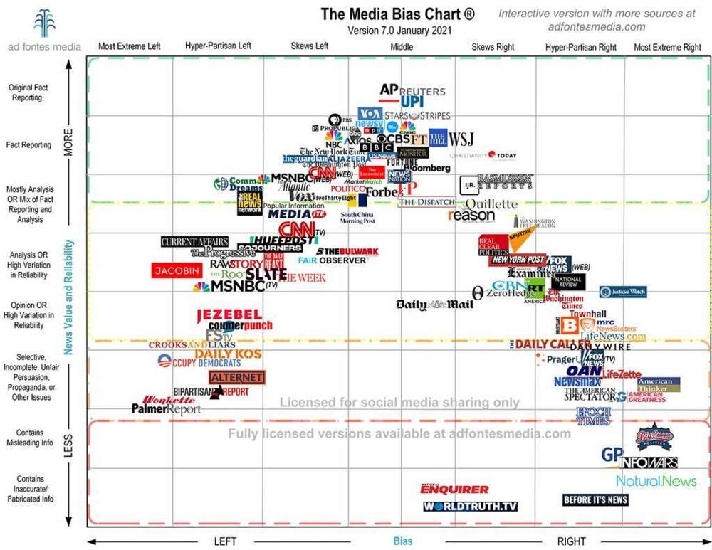 Отдельной обширной темой (если не «больным вопросом») является именно качество современной журналистики. Если частное мнение преподносится в разделе «Мнение» в газете с достойной репутацией, то это нормально. Но часто под видом новостей и анализа, например, подаётся «супчик» из идеологически подобранных ингредиентов, да ещё и приправленный красноречием. Естественно, это рассчитано на «самоуверенного болтуна», живущего в нашем левом полушарии, который чрезвычайно подвержен когнитивным искажениям. Чтобы противостоять этому эффекту, надо обладать недюжинной информационной грамотностью и самоконтролем. Ниже приведена обобщающая иллюстрация источников из исследования СМИ в США, проводимом Ad Fontes Media начиная с 2019 г.: