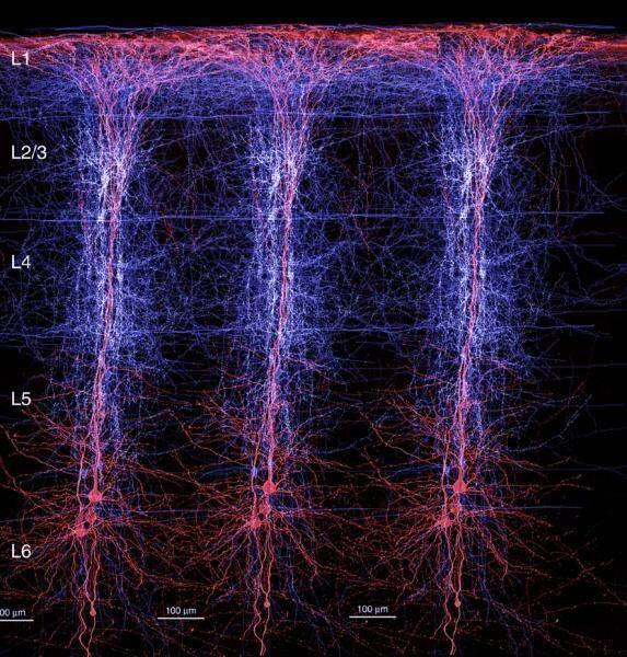 Кора больших полушарий мозга (или «церебральный кортекс», или обычно просто «кортекс») состоит из кортикальных колонок (вертикальных совокупностей нейронов). Каждая колонка это мыслительный модуль, иногда имеющий предопределённое сенсорное назначение и состоящий из шести слоёв «миниколонок» (у людей). Кортикальных колонок в «новом» кортексе у нас всего от 1-го до 2-х миллионов22. Неточность оценки возникает из-за множества горизонтальных связей на средних уровнях между «спутанными» колонками (из смежных областей сенсорного восприятия, например). «Разделённые» колонки физически выглядят следующим образом (заметьте, что даже они тесно связаны на высшем уровне мы к этому ещё вернёмся):