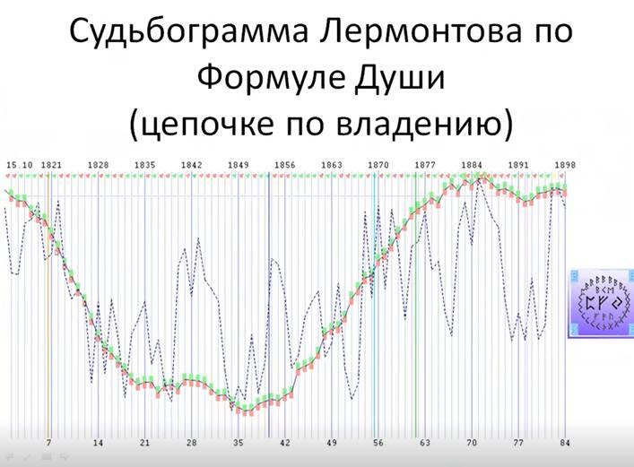 По утверждению Сергея Дресвянникова, кстати, очень верному, если проследить судьбу поэта, Лермонтов начинал очень бодро и энергично свою жизнь и творчество, а дальше жизнь заставляла его, образно выражаясь, танцевать на граблях, что видно на рисунке его судьбограммы: