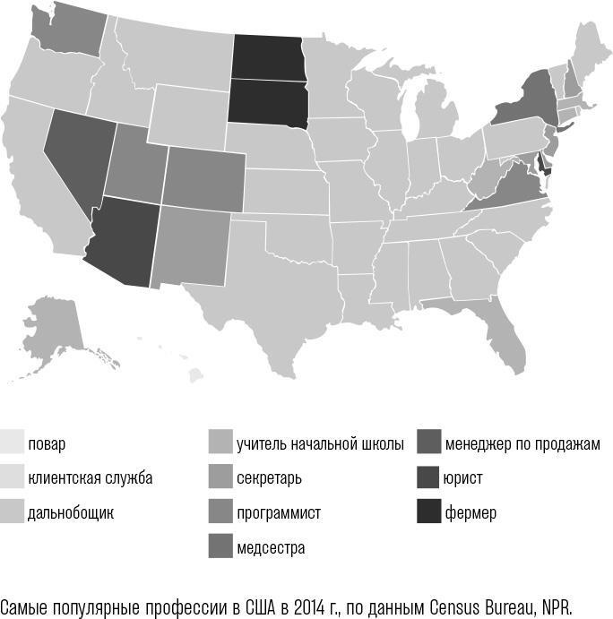 На этой карте США отмечены самые популярные профессии в 2014 году. В большинстве штатов это водитель грузовика. Согласно информации Американской ассоциации дальнобойщиков (ATA), в США работают 3,5 миллиона водителей, а ещё 5,2 миллиона человек трудится в индустрии грузоперевозок не за рулём. В сумме это 8,7 миллиона человек.