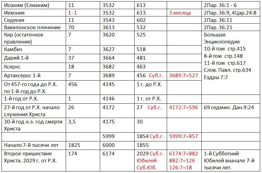 В праздниках и пророчествах указано точное время начала очищения Небесного Святилища, но не начала седьмой тысячи лет. Эти 2300 дней или 2300 буквальных лет закончились в 1844 году, и именно тогда начался суд, и очищение Небесного Святилища. Но конец 2300 лет не может быть началом седьмой тысячи лет, так как предыдущий год по нашим расчетам должен быть субботним. А так как семьдесят седмин это семьдесят субботних лет, то (2300-70х7=2300-490=1810) оставшееся время 1810 лет и даже 1809 лет не делится на семь, а значит, эти года не могут быть субботними. Это означает, что окончание 2300 лет никак не может быть началом седьмой тысячи лет, но лишь приблизительно указывает на ее начало.