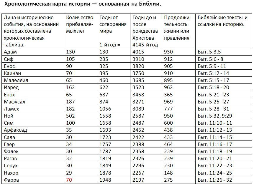 У Бога все имеет свой конкретный смысл. У Него ничего не бывает просто так. Зачем же тогда в Библии, которая так сжата и насыщена, вдруг понадобились эти скучные цифры. Зачем нам знать, кто, кого и когда родил? Как знание, во сколько Адам родил Сифа, может повлиять на наше спасение? Зачем нам эти даты, если не для того, что бы составить по ним хронологию. Хронологию по этим датам составляли и до меня, я лишь перепроверил и внес исправления. Итак: