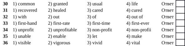 ***Прочитайте текст с пропусками, обозначенными номерами 3036. Эти номера соответствуют заданиям 3036, в которых представлены возможные варианты ответов. Запишите в поле ответа цифру 1, 2, 3 или 4, соответствующую выбранному Вами варианту ответа.