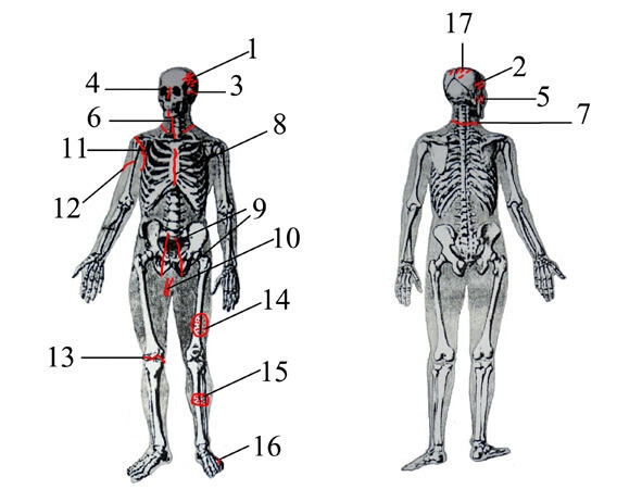 При внешнем осмотре были выявлены следующие телесные повреждения (см. анатомическую схему):