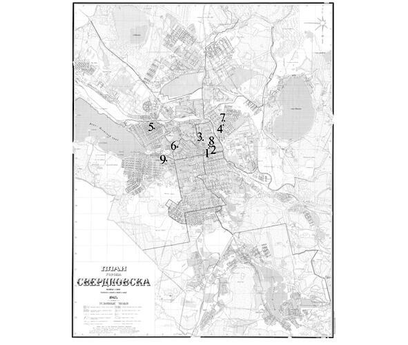 Карта г. Свердловска с указанием мест исчезновения детей в 19381939 гг. Точками обозначены места: «1» похищения 12 июля 1938 г. Герды Грибановой, «2» попытки похищения 10 февраля 1939 г. Бори Титова, «3» покушения на убийство 1 мая 1939 г. Раи Рахматуллиной, «4» похищения 12 июня 1939 г. Али Губиной, «5» похищения 30 июня 1939 г. Риты Ханьжиной, «6» похищения 22 июля 1939 г. Вали Камаевой, «7» похищения 27 июля 1939 г. Лиды Сурниной, «8» похищения 20 августа 1939 г. Ники Савельева и «9» исчезновения 12 сентября 1939 г. Вовы Петрова. После похищения в августе в Сталинском районе Ники Савельева преступник вновь вернулся в западную часть города, в район поселка Верх-Исетского завода. Видимо, он регулярно бывал в прилегающих к месту похищения кварталах, вполне вероятно, там жили его родственники, либо ему приходилось там появляться по делам работы или учебы. Во всяком случае, существовала веская причина (возможно, даже не одна!), способная правдоподобно объяснить знакомым и родственникам регулярные появления преступника в западной части города. Примечательно, что активность злоумышленника не распространялась на районы Свердловска к северу и югу от Сталинского. Причин тому могло быть несколько и самая очевидная из них худшая транспортная доступность северной части города, связанной с центром длинной петляющей трамвайной линией, по которой в 1939 г. был пущен только один маршрут.
