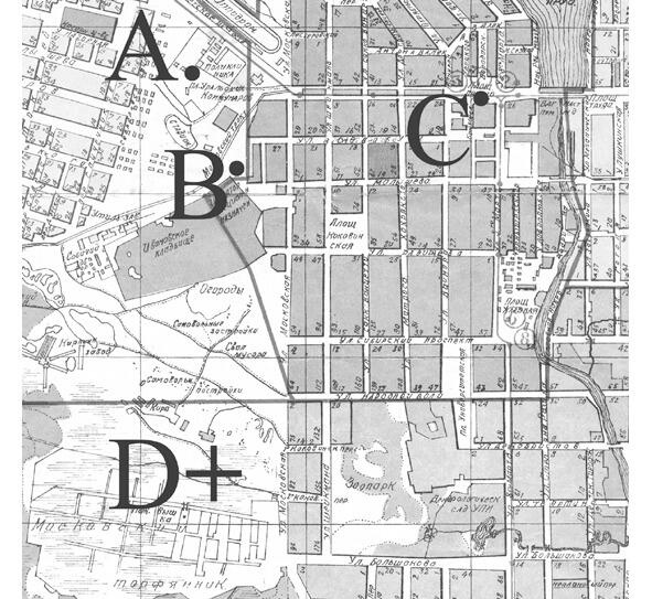 Карта восточной части Молотовского района г. Свердловска, позволяющая составить представление о перемещениях Вовы Петрова после его исчезновения около полудня 12 сентября 1939 г. Использован фрагмент карты 1932 г. как более точно передающей специфику застройки и городской инфраструктуры, нежели карты, датированные после 1940 г. Условные обозначения: «А» место проживания мальчика в бараке 1 на пл. Коммунаров, возле которого мальчика в 11:20 в последний раз видели мать и братья, в 12:45 именно от этого места начались его розыски; «В» сквер по ул. Репина, дом 4, в нём около 12 часов Мария Вяткина видела мальчика, в котором узнала Вову Петрова, мальчик был один; «С» площадь 1905 г., на которой пропавшего мальчика независимо друг от друга около 13 часов или несколько позже видели Михаил Кириллов и Лиза Бухаркина. Свидетели хорошо знали мальчика и исключали ошибку опознания, по их хорошо согласующимся показаниям Вова Петров шёл в обществе крупной женщины в пальто, двигался он в направлении улицы 8-го марта, т.е. удалялся от места проживания; «+D» место обнаружения трупа Вовы Петрова в районе Московского торфяника Еленой Бурениной и Дарьей Стерлиговой около 17 часов 12 сентября (т.е. спустя 5 или даже менее часов с момента исчезновения ребёнка). Место показано условно, поскольку в официальных документах нет точной привязки к ориентирам на карте, а содержится лишь невнятное указание на местонахождение трупа в районе мыловаренного завода (причём, расстояние до него также не указано). Расстояния от А до С примерно 1,5 км., от В до С примерно 1,2 км., от А до D неопределенно, поскольку точное положение D неизвестно, но никак не менее 2 км. по прямой, от С и D тоже неопределенно в силу означенной причины, но при любых условиях больше расстояния между А и D. Все поименованные точки однозначно связаны с Вовой Петровой и его присутствие в этих местах в указанное время не вызывает сомнения. Однако, при взгляде на карту нельзя не заметить труднообъяснимую разбросанность отмеченных мест. Все они взаимно удалены на значительные расстояния и вызывает большие сомнения возможность маленького мальчика (его возраст, напомним, 3 годика!) самостоятельно такие расстояния преодолевать. Можно допустить, что Вова сам ушёл от дома к скверу у тюрьмы и похищение произошло именно там, а вовсе не возле дома. В этом случае направление движения похитительницы, замеченной на площади 1905 г. свидетелями Кирилловым и Бухаркиной, уводившей ребёнка прочь от места следует признать вполне логичным. Однако, дальнейшее движение похитительницы представляется в высшей степени страннным. Кажется невероятным, чтобы хорошо одетая женщина (притом в обуви на каблуках!) лично повела жертву на торфяник с целью убийства. Кроме того, много вопросов рождает мотивация действий женщины-убийцы. Хотя феномен женщин-детоубийц существует, всё же, совершаемые ими преступления обычно совершенно иного типа, нежели то, что мы видим в данном случае. Использование ножа в качестве орудия убийства также заставляет усомниться в том, что умерщвление осуществлялось женщиной. И хотя присутствие женщины на месте убийства полностью исключать нельзя след обуви маленького размера вполне мог принадлежать именно ей всё же, в данном случае чувствуется рука убийцы мужского пола. Однако, это допущение заставляет предположить сговор по ме