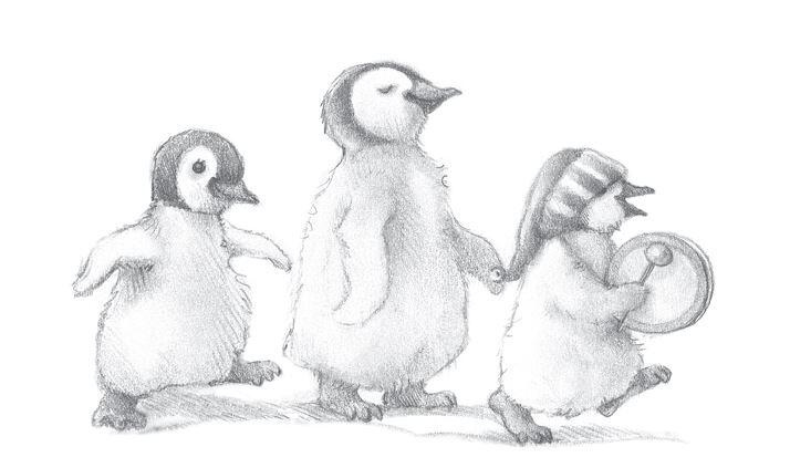 Вскоре все пингвинята двинулись за ним, приплясывая, подпрыгивая и подскакивая на ходу. Пошёл снег, и малыши стали подпрыгивать ещё больше.