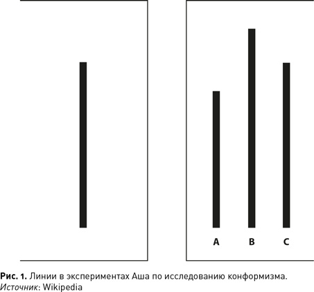 Первое слово здесь сказал Соломон Аш. В своем самом известном эксперименте он предлагал испытуемым ответить на простой вопрос: «Какая из трех линий имеет такую же длину, что и первая линия?» (см. рис. 1)[20]. Из трех линий разной длины одна совершенно очевидно соответствовала первой. Тем не менее участники делали ошибку более чем в 30 % случаев. Почему люди давали столь явно неверный ответ? Прежде чем каждого участника просили высказать свое мнение, несколько человек уже успевали вслух ответить. Реальный испытуемый не знал, что все они были сообщниками экспериментатора. В некоторых попытках все такие имитаторы согласованно давали неправильный ответ. Они не имели никакой власти над испытуемым, не были с ним знакомы и давали ошибочные ответы намеренно. Несмотря на это, более 60 % опрошенных предпочли хотя бы один раз присоединиться к мнению группы. В учебнике Сержа Московичи, авторитетного социального психолога, эти результаты оцениваются как «одна из самых выразительных иллюстраций конформизма, слепого соглашательства с группой, даже если индивид понимает, что, поступая подобным образом, он поворачивается спиной к реальности и истине»[21].