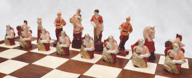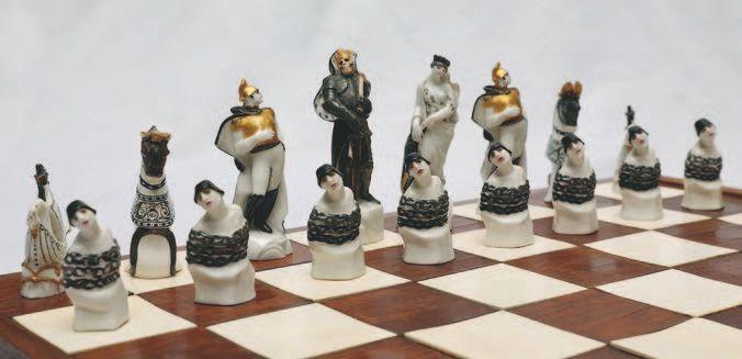 Заключительное появление аллегорического женского образа в искусстве революционных лет, которое стало, наверное, итогом для всех тенденций, описанных в этой главе, состоялось не в живописи, а в мелкой пластике фарфоровых шахматах «Красные и белые» (1922)40 скульптора Натальи Данько. Сама идея шахмат как военной игры с двумя враждующими лагерями, отмеченными цветовой символикой, естественно продолжила героику плакатов Гражданской войны. Однако, как и на профсоюзных хоругвях, революционная геральдика здесь переплелась с отсылками к символизму и эклектике.