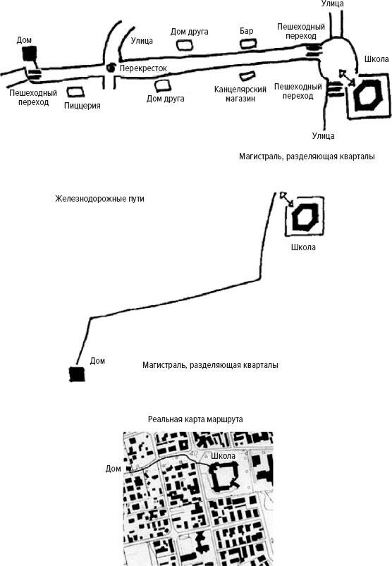 4. Карта, нарисованная десятилетним мальчиком, который ходит в школу сам (вверху), и карта, нарисованная десятилетним мальчиком, которого возит на машине взрослый (в центре). На нижнем рисунке реальная карта маршрута
