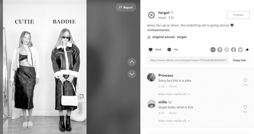 Сеть магазинов Target креативит на стыке подборок и «до и после». На экране появляются две копии девушки, в одной и той же юбке. Над первой подписано cutie (милашка), над второй baddie (злодейка). Остальные предметы гардероба ритмично появляются на героинях в соответствии со стилем. Так магазин показывает универсальность модели юбки.