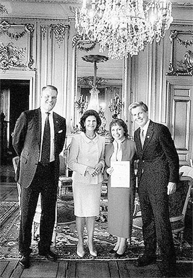 Генеральный директор компании'Oriflame Магнус'Брэннстром, королева Швеции Сильвия, Тамилла Полежаева и'сооснователь компании Oriflame Роберт аф Йокник