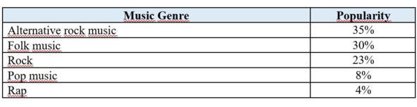 38.1 Imagine that you are doing a project on what music genres are popular in Zetland. You have found some data on the subject the results of the opinion polls (see the table below).