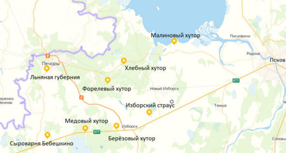 В Печорском районе, недалеко от основных достопримечательностей, а именно, Изборской крепости и Свято-Успенского Псково-Печерского монастыря, появилось множество частных ферм и музеев, причём большинство из них именуется хуторами, что указывает на небольшой размер «предприятий». Таким образом, на исторически сложившейся территории функционируют малые фирмы, специализирующиеся на одной отрасли.