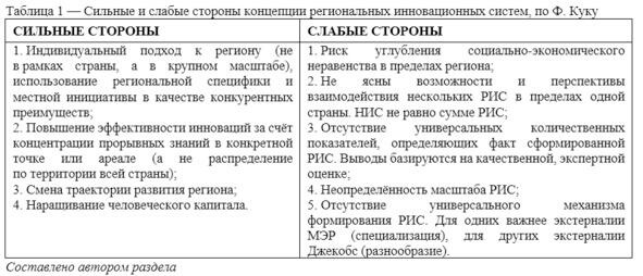 Высокая эффективность в рамках РИС достигается за счёт точечной концентрации прорывных знаний. Географическая близость обусловливает возможность взаимодействия их носителей, которое в свою очередь может быть дополнительно усилено влиянием других видов близости. В то же время устойчивый рост интенсивности инновационных процессов в ядре РИС создаёт риски углубления социально-экономического неравенства с другими частями региона. Из этого следует необходимость постоянного мониторинга ситуации и параллельного создания инструментов транслирования инноваций ядра на периферийные и полупериферийные территории. Также среди недостатков концепции стоит отметить неясность характера взаимодействия нескольких РИС одной страны, отсутствие универсальных количественных показателей, определяющих факт инновационности региональной системы, а также отсутствие универсальных механизмов формирования и функционирования РИС (таблица 1).
