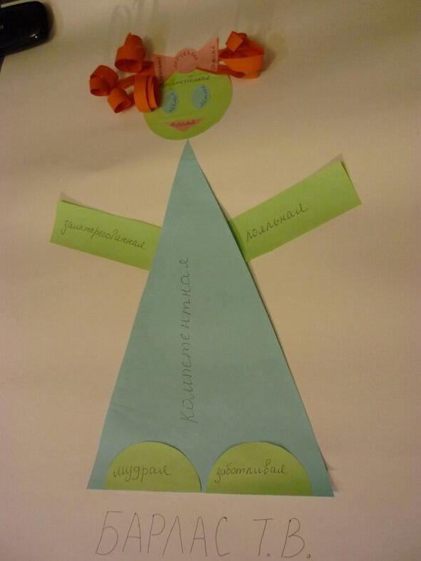 Одна из групп ограничилась образом «героя», которым оказалась я. Мамадорогая! Чего только они не понаписали «Компетентная» (туловище), «мудрая», «заботливая» (ноги), «заинтересованная», «лояльная» (руки), «веселая» (рот), «прямая», «честная» (глаза), «ответственная» (лоб), «творческая», «внимательная», «открытая» (бантик), «понимающая», «отзывчивая», «оптимистичная», «тактичная», «психолог-практик», «хороший рассказчик», «юная душой» (кудряшки).